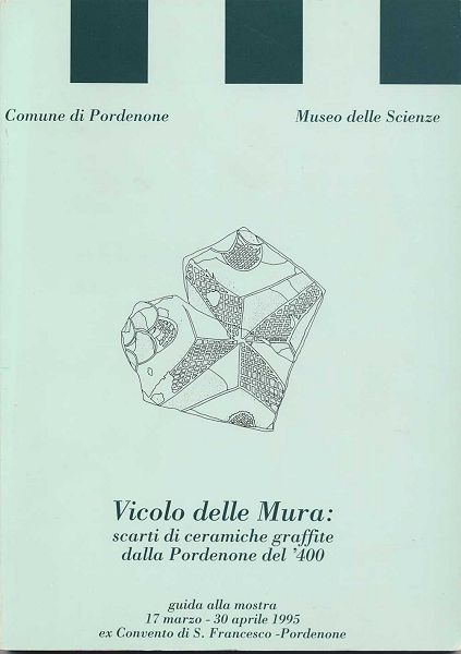 | Vicolo delle Mura: scarti di ceramiche graffite dalla Pordenone del ‘400 (guida alla mostra 17 marzo-30 aprile 1995)(a cura di Anna Nicoletta Rigoni), Pordenone 1995, Tipografia Sartor, disponibile per scambio. |
